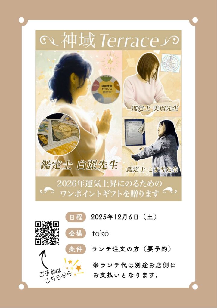先日お知らせした12月6日のイベント【神域Terrace in tokō】の予約が入り始めたようです✨